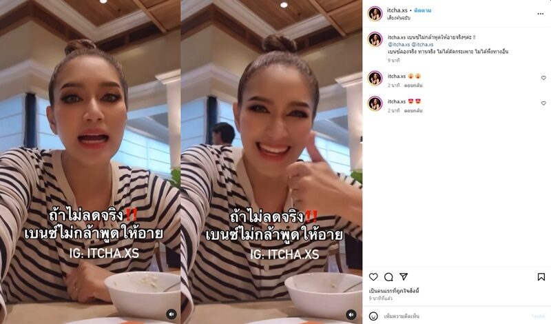 โดยสาวเบนซ์ กำลังไลฟ์ อ่านคอมเมนต์ พร้อมยินดีกับคนเข้ามาบอกว่า น้ำหนักลงตั้งแต่กินกล่องแรก เบนซ์ บอกด้วยว่า หลายคนกินตามเบนซ์ พร้อม ยืนยันว่า เบนซ์ พูดจริง